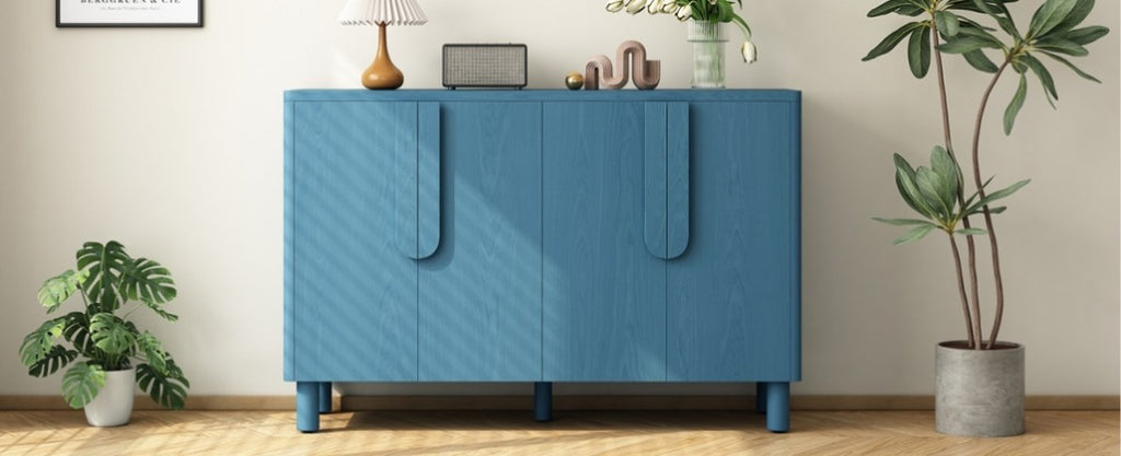 Sturdy Construction: Made from high-quality MDF with solid pine legs, the sideboard cabinet ensures long-lasting durability. Featuring solid cylindrical legs with adjustable foot pads and an additional center support, this design ensures superior stability, enhanced weight capacity, and long-lasting durability. The top surface supports up to 220 LBS, while each adjustable shelf holds 50 LBS, and the bottom shelf supports 66 LBS.