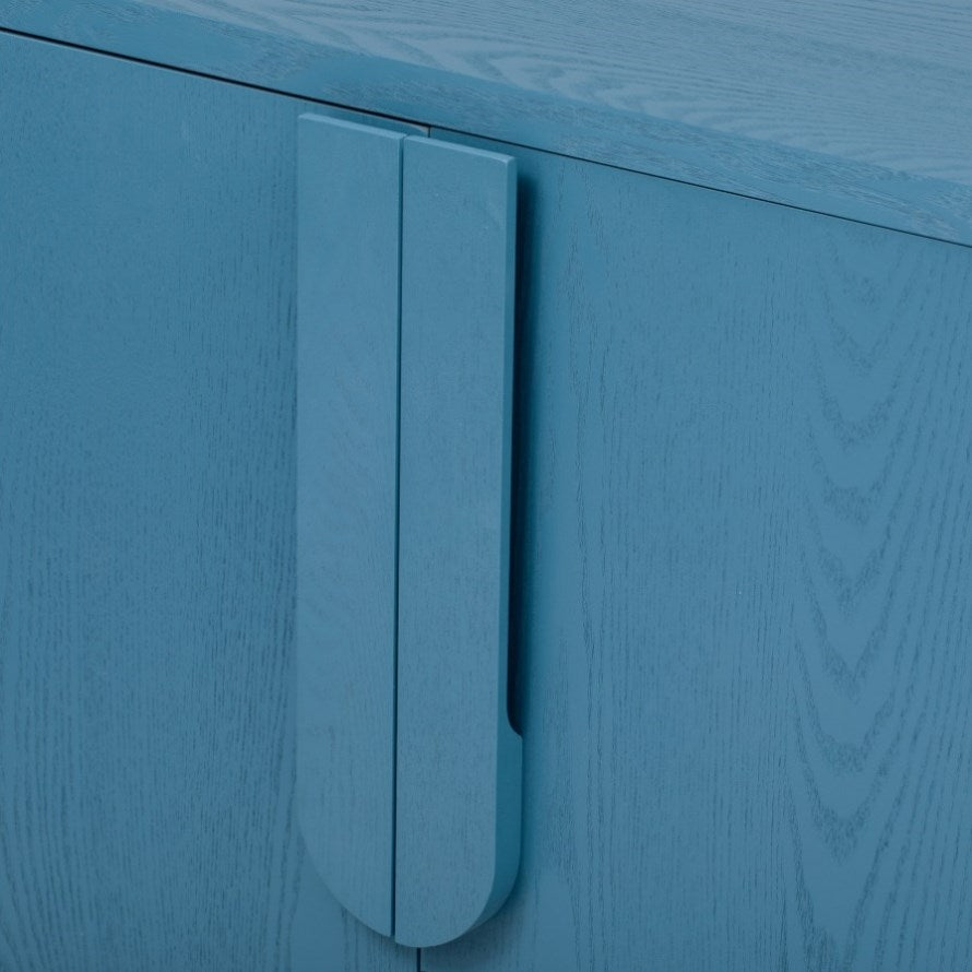This sideboard buffet cabinet features a natural wood grain surface with an elegant ash veneer finish. The standout feature is its uniquely designed arc handles, which blend seamlessly into the cabinet doors, creating a sleek, minimalist look while ensuring effortless operation.