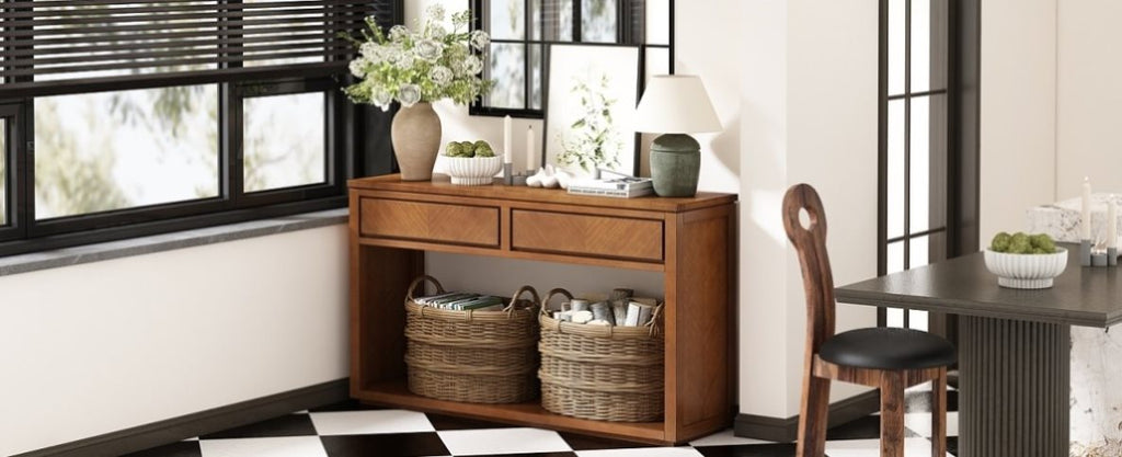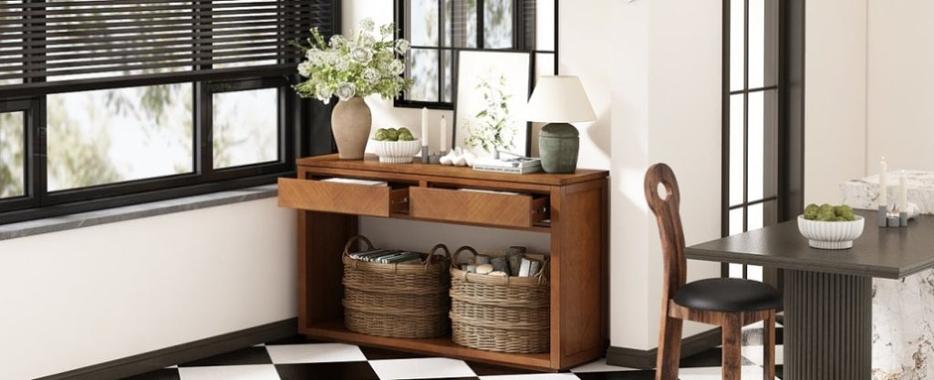 Spacious Storage with Two Drawers: Equipped with two sliding drawers, this entry table offers ample storage space for your everyday essentials. Whether it's keys, mail, or other small items, the drawers keep everything organized and within easy reach. The smooth gliding mechanism ensures effortless access, while the seamless design integrates the storage perfectly into the table's elegant structure.