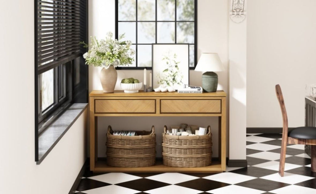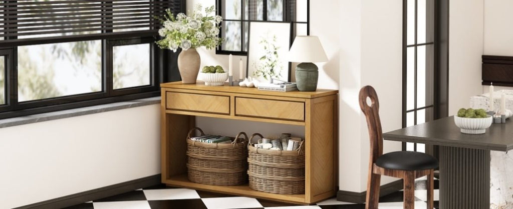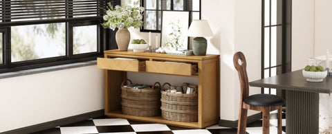Spacious Storage with Two Drawers: Equipped with two sliding drawers, this entry table offers ample storage space for your everyday essentials. Whether it's keys, mail, or other small items, the drawers keep everything organized and within easy reach. The smooth gliding mechanism ensures effortless access, while the seamless design integrates the storage perfectly into the table's elegant structure.