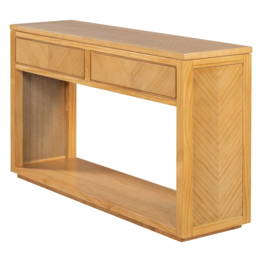 This console table features an exquisite chevron pattern on the tabletop and sides, adding a touch of sophistication to any room. Its intricate design showcases fine craftsmanship and a timeless aesthetic, making it a perfect addition to modern or traditional interiors. The smooth finish enhances its beauty, while the natural wood tones provide warmth and charm to your living space.