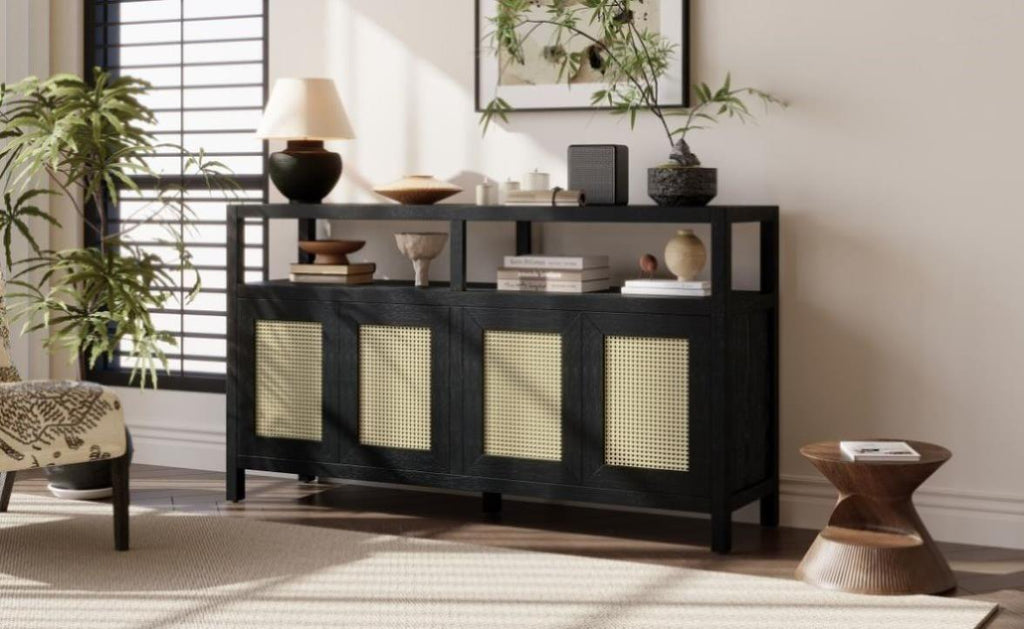 Flexible Storage for Every Need: Open shelf offer easy access to decor, books, or daily essentials, while the interior features 3-position adjustable shelves to customize height for tall vases, dinnerware, or storage bins. The concealed cabinet with rattan doors hides clutter, supported by a 250LBS top panel and 60LBS weight capacity per shelf—ideal for organizing heavy items in high-use living and dining areas.
