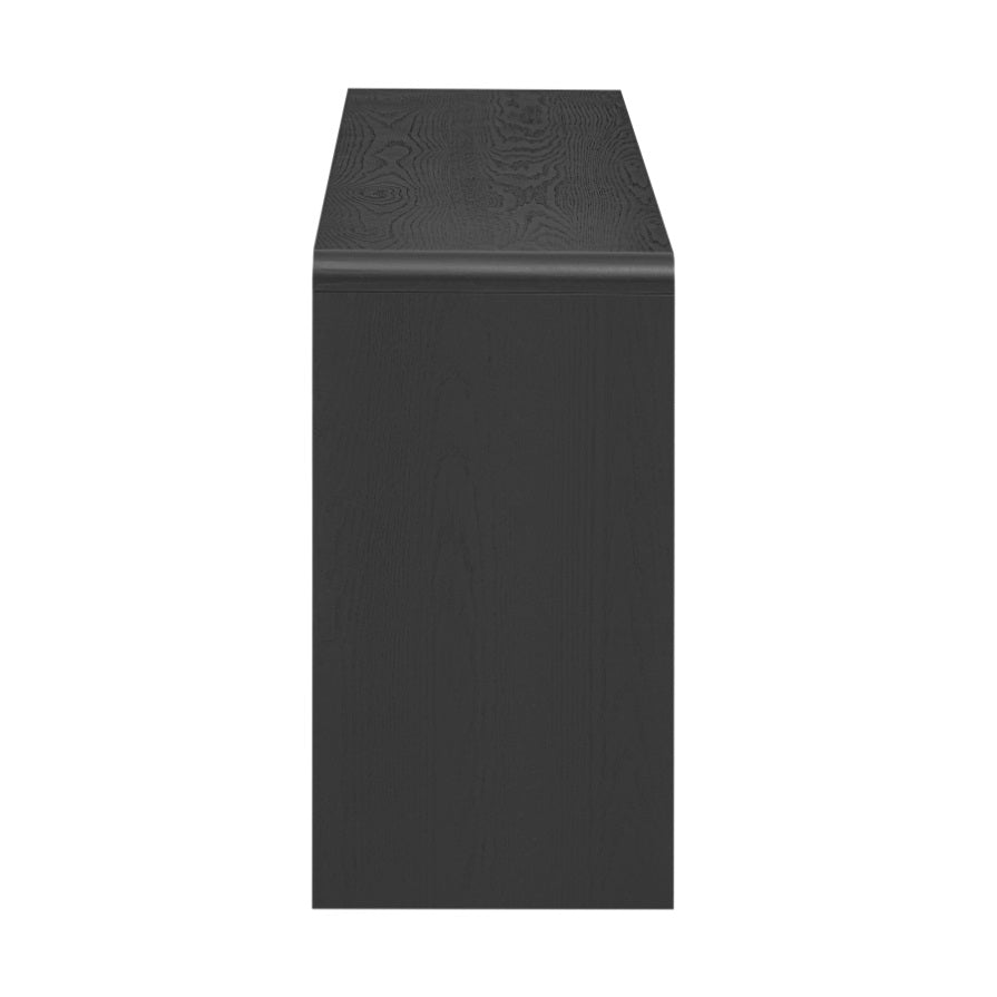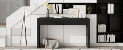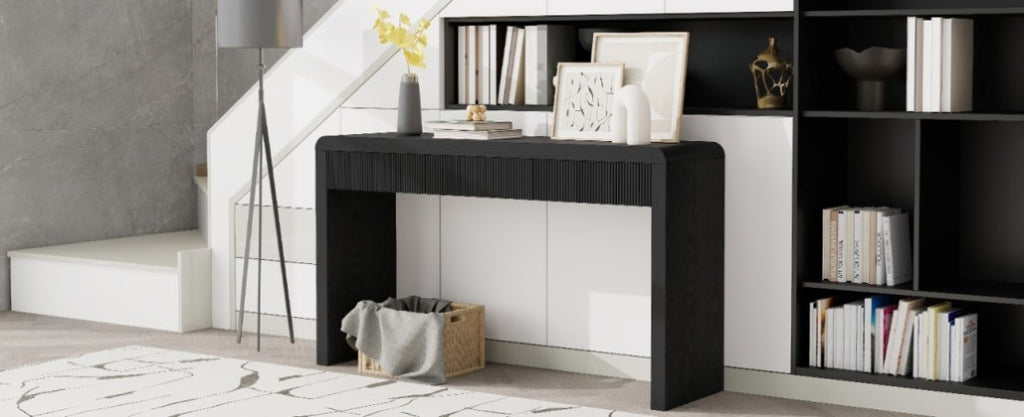This console table showcases fluted drawer fronts, creating a visually striking texture. Crafted from MDF with solid wood veneer, it blends modern minimalism with rustic charm. The curved edge design ensures a sleek, clutter-free look, while the wood veneer adds warmth and authenticity.The tabletop supports 220 LBS, making it ideal for showcasing decorative items, large vases, or even coffee machines, record players, and other small household appliances.