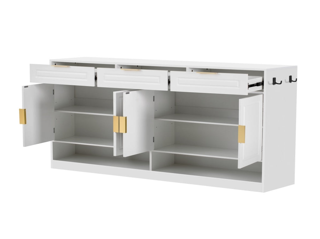 Features three spacious drawers for utensils, linens, or small essentials, and four doors offering generous concealed storage.Two large open shelves at the bottom are perfect for displaying decor, baskets, or frequently used kitchenware.