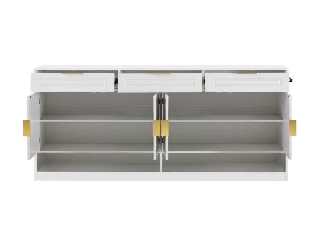 Combining modern style with practical storage, this 59.1-inch cabinet is crafted from high-quality MDF for long-lasting durability and a refined finish. Aluminum alloy handles add a sleek metallic touch while ensuring sturdy, everyday use. Thoughtfully designed with three drawers, four cabinet doors, adjustable inner shelf, and two open compartments, it provides abundant space for both display and organization. Perfect for dining rooms, living spaces, kitchens, or entryways, this versatile piece brings elegance, order, and functionality to any home setting.
