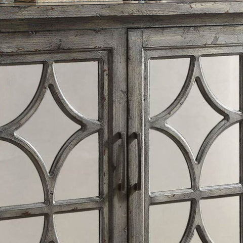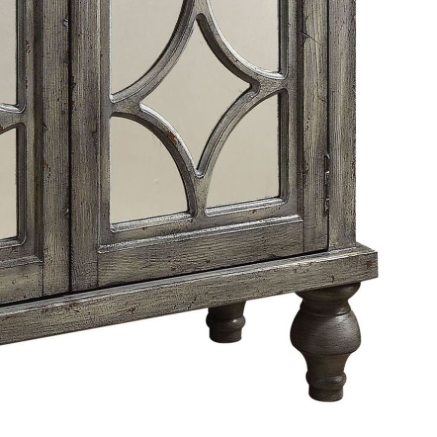 The weather grey finish of this cabinet emanates a rustic yet elegant charm, perfectly complementing a range of interior styles. Its diamond trim inlay adds a captivating touch of luxury and uniqueness, while the two-door cabinet offers convenient storage options for organizing and decluttering belongings, making it a versatile addition that seamlessly blends into various settings.