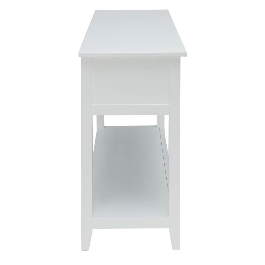 In addition to the drawers, the table includes open storage with a bottom shelf, providing extra space for displaying decor or storing larger items