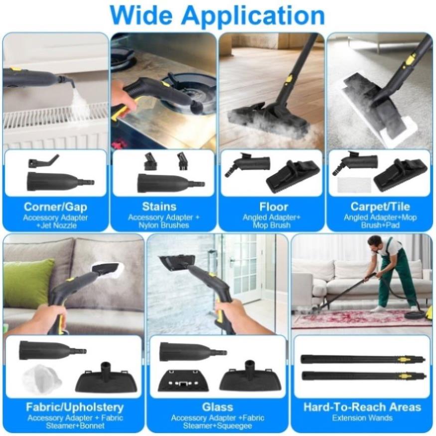 - Versatile Attachments for All Surfaces: Our multi-purpose steamer cleaner includes a variety of accessories such as a mop brush, fabric steamer, glass squeegee, and brushes, tackling stubborn grease, dirt, and bacteria on all surfaces—making it suitable for formaldehyde treatment, car detailing, high-temperature sterilization at home, fabric steaming and more.