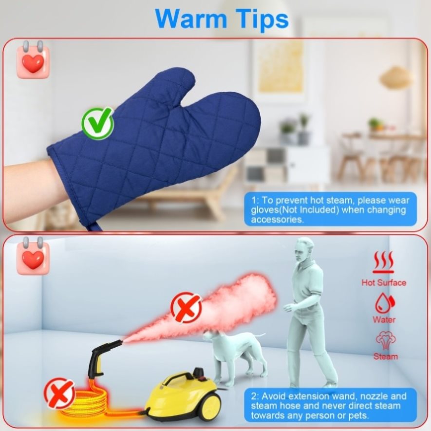 - Multiple Safe & Portable Designs: Our portable steamer cleaner not only provides 464℉ overheat protection, explosion-proof double-layer steam hose and safety valve for safe operation, but also ensures maximum flexibility and maneuverability with 360° easy-rolling wheels, portable handle, 2 extension wands, 16.83ft ultra-long power cord and 7.1ft steam hose.