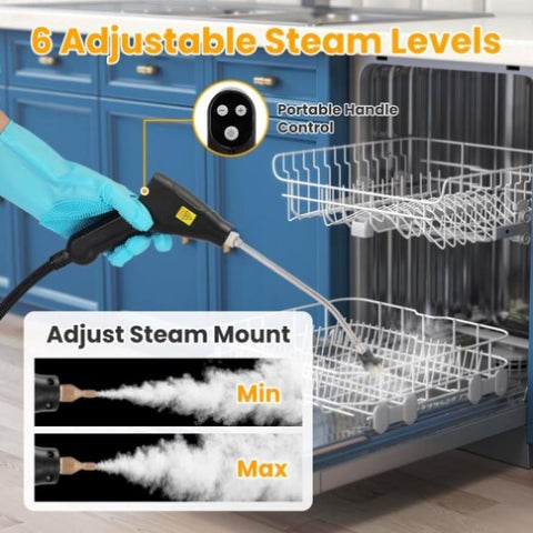 - 6 Adjustable Steam Levels: Adjust the steam intensity from 1 to 6 to tackle various cleaning tasks, from light dusting to heavy-duty degreasing. This high heat steamer is ideal to clean out any hard to reach gaps, corners, angles, and various surfaces/materials.