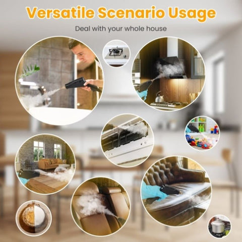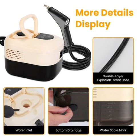 Transform your cleaning routine with this versatile handheld steamer cleaner. This 1500W handheld steamer cleaner generates 3.5 Bar pressurized steam at 212℉ in 15s, killing 98.9% of bacteria. With 6 adjustable steam levels, it handles tasks from light dusting to heavy degreasing. Its 1200ML tank provides 1 hour of continuous steam. Features dual control, digital display, overheating and dry burning protections. The comprehensive kit includes various attachments for diverse surfaces, offering safe, versatile cleaning for home and more.