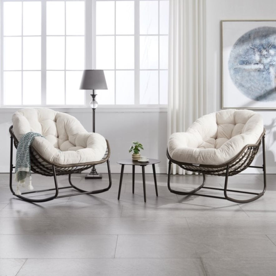 Our rattan chairs are meticulously hand-woven with high-quality synthetic rattan material, the rattan is not easy to fade and durable. Enjoy the sunbathe with our oversized rocking chair and it will bring you a different experience.