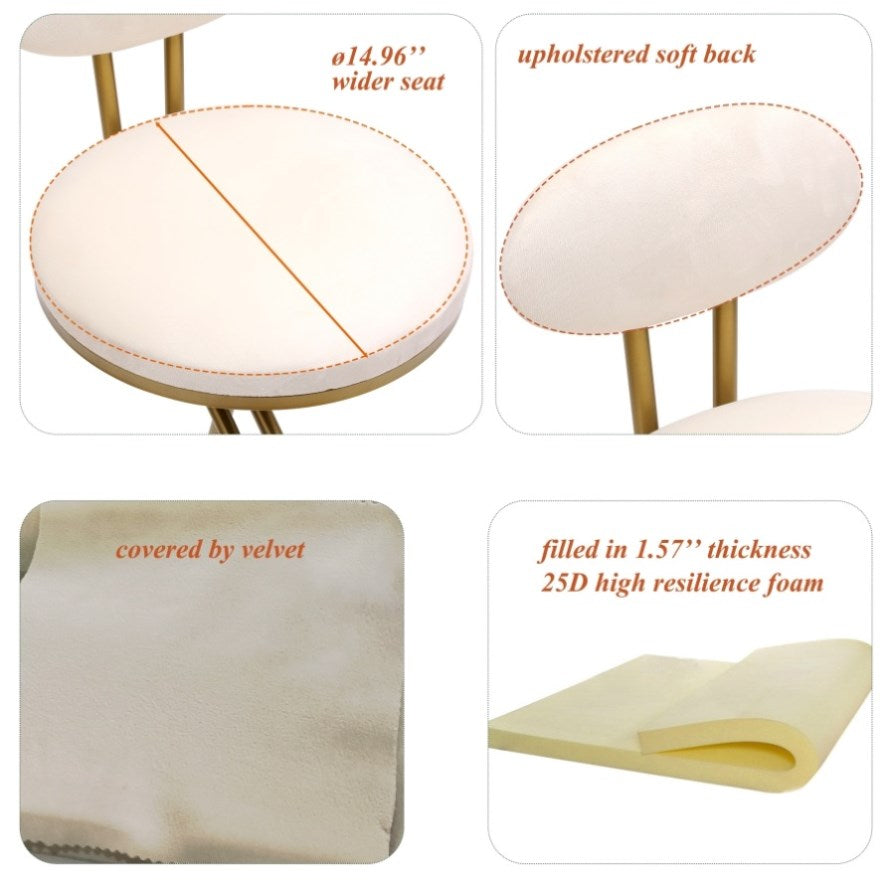 Sturdy & Durable: Each barstool with back is supported by a golden powder-coated metal frame, carefully designed to resist rust and maintain shape over time. The sturdy round base has a diameter of 17.12'' (43.5cm), providing excellent stability and preventing wobbling. The base has several pieces anti-slip rubber protectors to prevent the floor from scratching and keep stool's balance if floor is uneven.