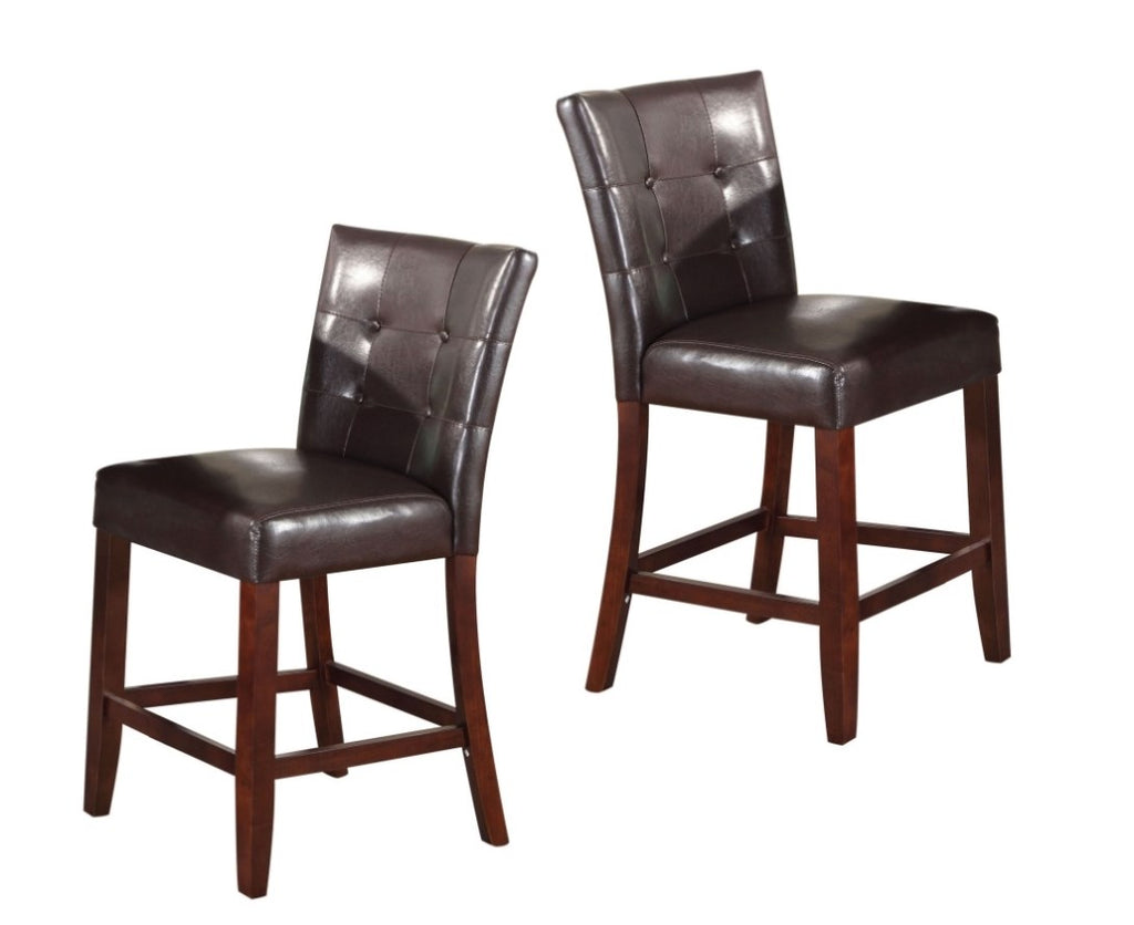 Upgrade your kitchen, dining room, or living space with these charming, transitional counter-height chairs. Fully upholstered in PU leather, with button-tufted backrests and walnut finish tapered legs, they offer both elegance and comfort.