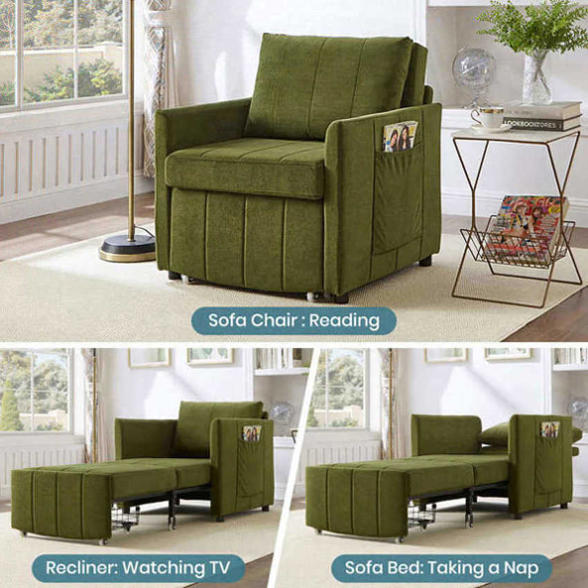 This versatile sofa is designed to meet a variety of needs with its multi-functional features. It effortlessly transforms from a comfortable seating chair to a reclining lounge chair, and can also be converted into a full single bed, making it a perfect solution for small spaces or accommodating guests. The backrest offers five adjustable recline positions, allowing you to find your ideal comfort level, whether you’re sitting upright or fully reclining. The sofa also includes convenient side pockets and a storage basket under the sofa bed for storage, keeping your space organized and clutter-free. Upholstered in soft and durable chenille fabric, it combines elegance with long-lasting comfort, making it a stylish and practical addition to any home.