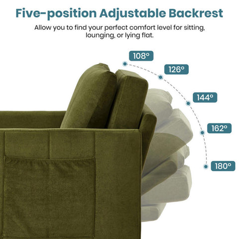 Five Adjustable Recline Positions - The backrest of this sofa bed features a unique five-position adjustable recline function(108°, 126°, 144°, 162°and 180°), allowing you to find your ideal angle of comfort. Whether you prefer to sit upright for reading or watching TV, or recline fully for a restful nap, the backrest can be easily adjusted to suit your preferences.
