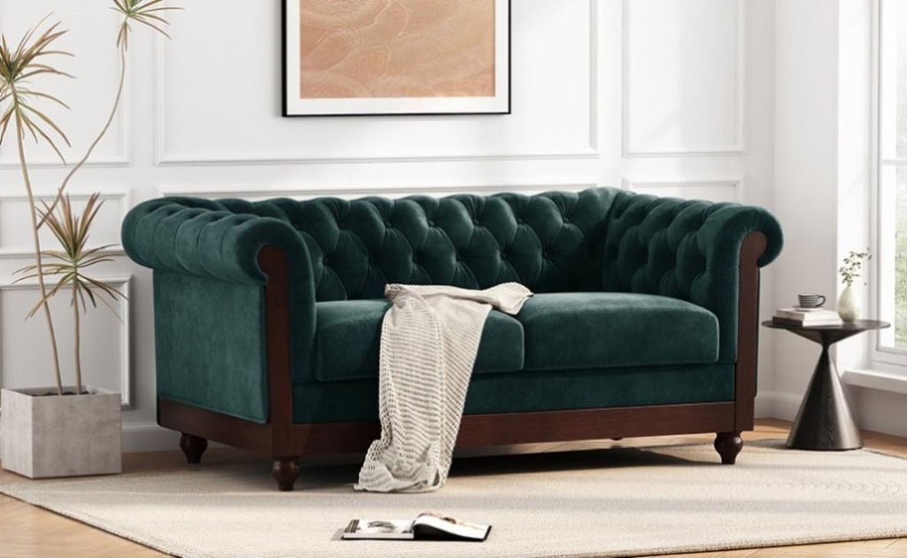 Summary Discover comfort and style with our Chesterfield Velvet Loveseat Sofa, designed to enrich your living room or bedroom. Crafted with a durable pine wood frame and plush velvet fabric, this loveseat offers a timeless rolled arm design with tufted buttons, supporting up to 300 lbs per seat. Available in three colors to match any decor. Perfect for cozy, intimate settings.