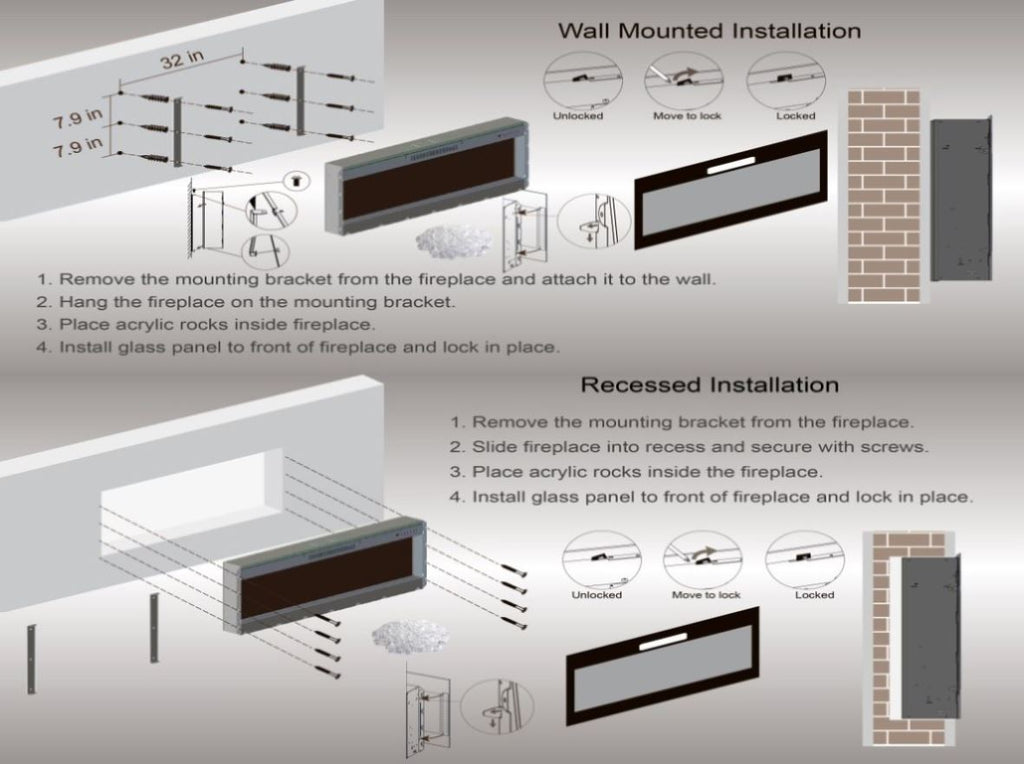 The fireplace can be wall mounted or in-wall recessed by yourself easily.The recessed electric fireplace could be fully recessed into wall easily or you can use our own installation accessories and brackets to hang this wall mounted electric fireplace on any wall in any room.