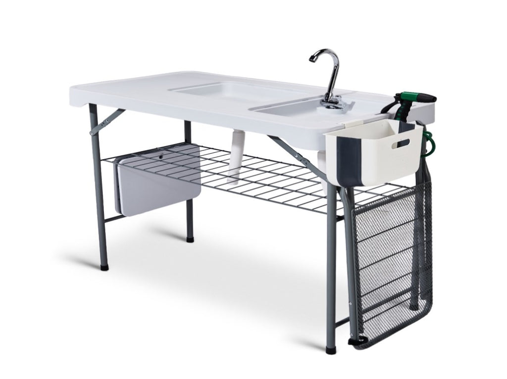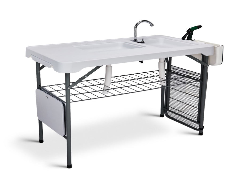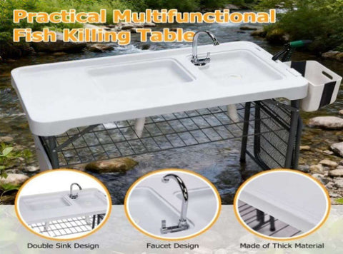 This fish cleaning table is a practical outdoor workstation designed with a spacious tabletop, dual built-in sinks, and a stable folding structure. It is ideal for anglers, campers, and families who need a reliable surface for cleaning fish, washing food, or preparing meals during outdoor activities. Suitable for use at campsites, backyards, picnics, or near lakes and docks, this table helps keep cleanup organized and efficient. The integrated sinks allow water-based tasks to be done in one place, while the foldable extension stand offers extra space for tools and supplies. Built with durable materials and a sturdy frame, the table is designed to handle regular outdoor use while remaining easy to fold, transport, and store when not in use.