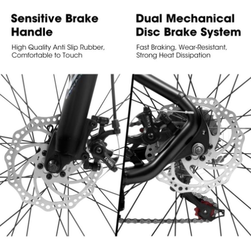 Brake&ShifterFront and rear disc brakes ensure timely and effective braking,provide you better durability and stopping power for your rugged and damp adventures.The 21-speed drivetrain with Shimano shifters and Trigger Shifter allows you to find the most comfortable and efficient gear for the kind of road.