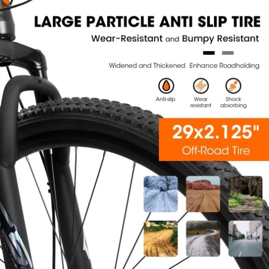 29*2.125" Tire29*2.125" Rubber mountain pattern tires with high friction. Anti-skid and wear-resistant with strong grip and puncture resistance for hillsides, gravel, city streets and trails.