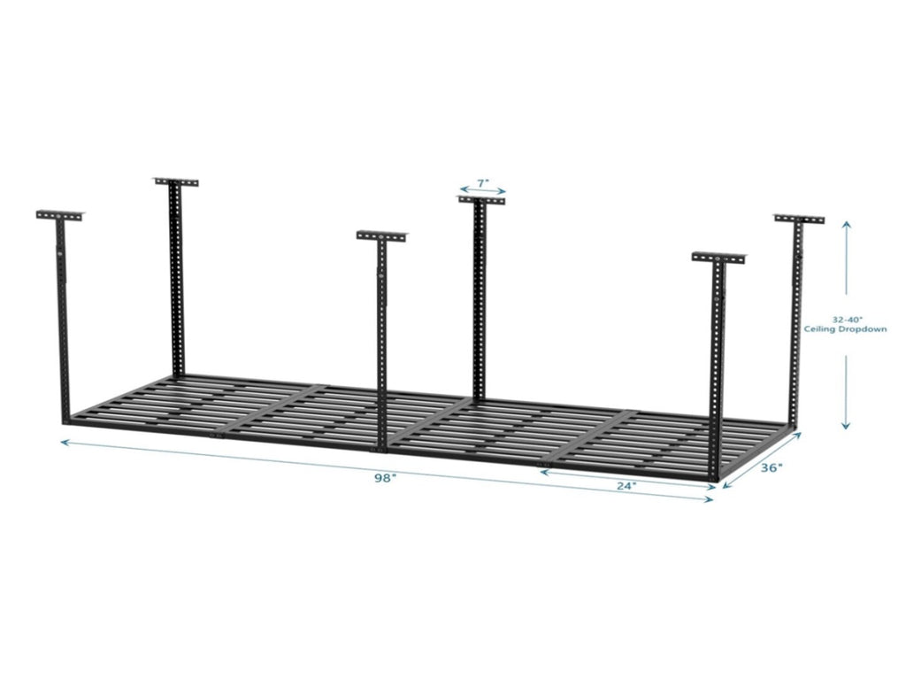 Transform your cluttered garage into an organized and spacious haven with our Overhead Garage Storage Rack. Crafted from durable alloy steel, this heavy duty storage rack is designed to maximize your available space and simplify your life. With dimensions measuring 36 inches in width, 96 inches in length, and a versatile ceiling dropdown range of 22 to 40 inches, this rack offers a world of possibilities for efficient storage.