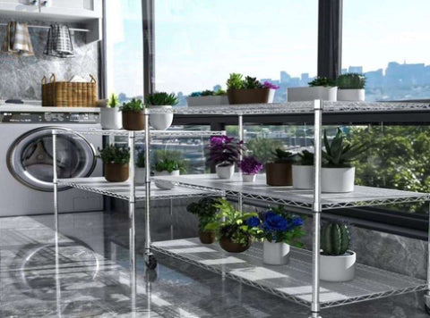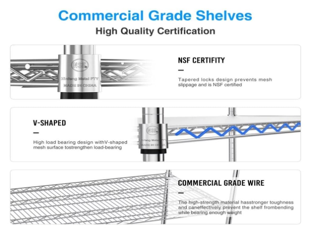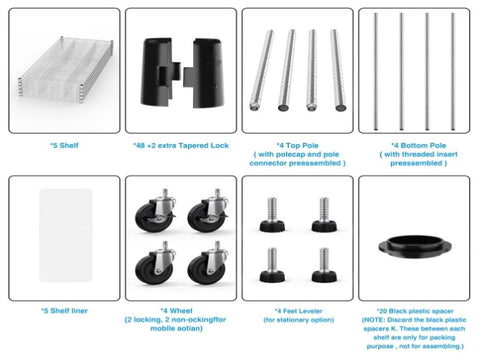 [5 TIER LARGE CAPACITY] - Heavy duty shelving with leveling feet - each layer shelf can hold 1200lbs (evenly distributed), maximum load capacity is 6000lbs. It is recommend that heavy items on the bottom shelf for maximum stability. 5 shelf Liners choice of beautiful and fun transparent colors allow you to add a pop of color to your life. Shelf liners is waterproof - Won't get damaged from exposure to moisture. [STURDY & EXTREMELY DURABLE] - Wire shelving made of heavy steel, it has excellent rust resistance and oxidation resistance. Our wire shelf liner is crafted to provide unparalleled quality, longevity, function and beauty. Better quality thicker than the competition. The 5 tier shelf unit passed NSF certified, safe and reliable. Storage rack are perfect addition to home, office, garage. [ADJUSTABLE DESIG] - Each shelf can adjustable in 1-inch increments, adjust the shelf height according to size of the item, meet your different needs, get the best utility shelf. Create two new shelf by splitting the top pole, you can split it according to your actual needs and achieve multiple uses. [EASY MOVEMENT] - 5 tier garage shelves have 4 leveling feet, 4 4-inch industrial wheels(2 lockable). Wire rack on wheels can be easily positioned in supermarkets, garages, closets, kitchens, porch, pantry, etc. Height-adjustable leveling feet can be placed on uneven ground- simply twist to stabilize. Non-slip, will not scratch ground. [EASY TO ASSEMBLE] - With detailed instructions and no tools required, you can install it easily with another person within 15 minutes. There are many parts in the package, please feel free to contact us via buyer message if meet the case of missing parts and assembly.