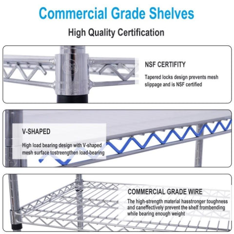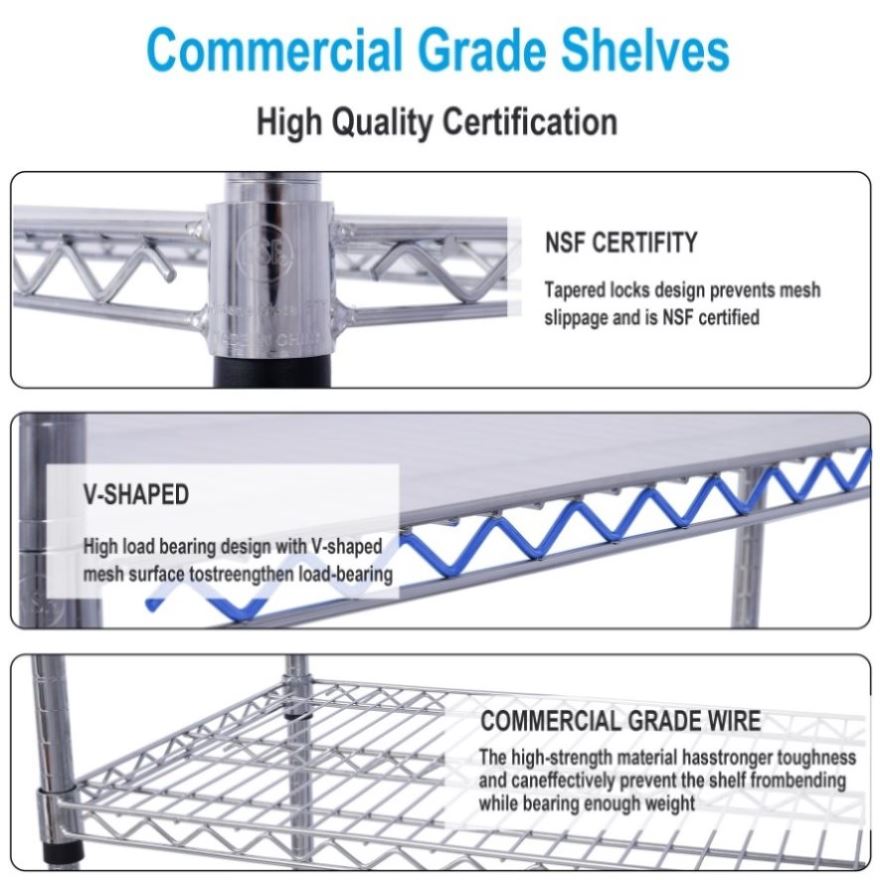 Unrivaled Durability: Constructed from heavy steel, our wire shelving boasts exceptional rust and oxidation resistance, ensuring unparalleled quality, longevity, and functionality. The wire shelf liner is of superior quality, thicker than the competition, and the entire 6-tier shelf unit has passed NSF certification, guaranteeing safety and reliability. This storage rack is the perfect addition to any home or office space.