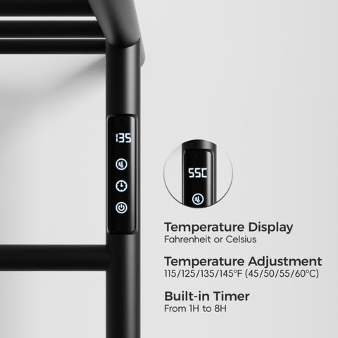 Smart Touchscreen Control : The user-friendly touchscreen allows effortless customization of the heating experience. After turning on the heated towel rack, it will heat up in 3-7 minutes and reach the optimal temperature of 122-131℉ within 30-40 minutesThe towel rack has a built-in overheating protection function, which will not overheat the heating rod and burn you or cause the towel to be scalded. You and your family will get comfortable towels after showering.