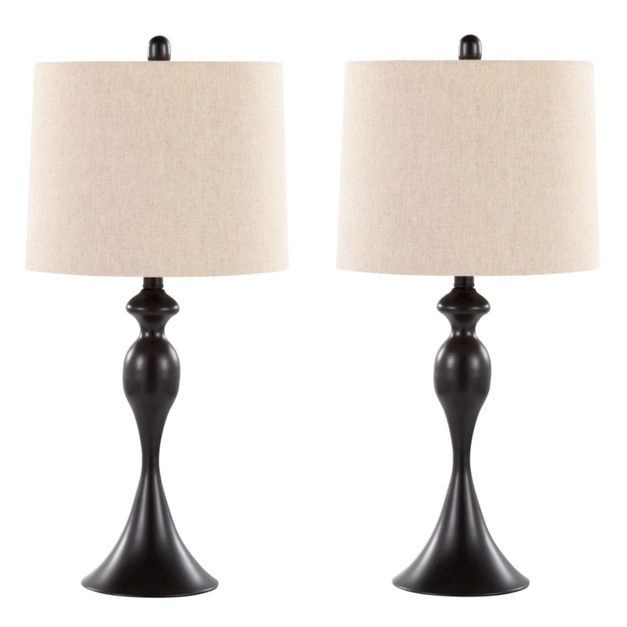 This sleek set of Ashland Table Lamps from Grandview Gallery by LumiSource cuts an eye-catching figure. With their curvaceous hourglass silhouettes, these lamps add sensuous class to any room. Each lamp is crowned by elegant double-layered shades and comes in a variety of colors, so you can pick a combination that suits your space the best.