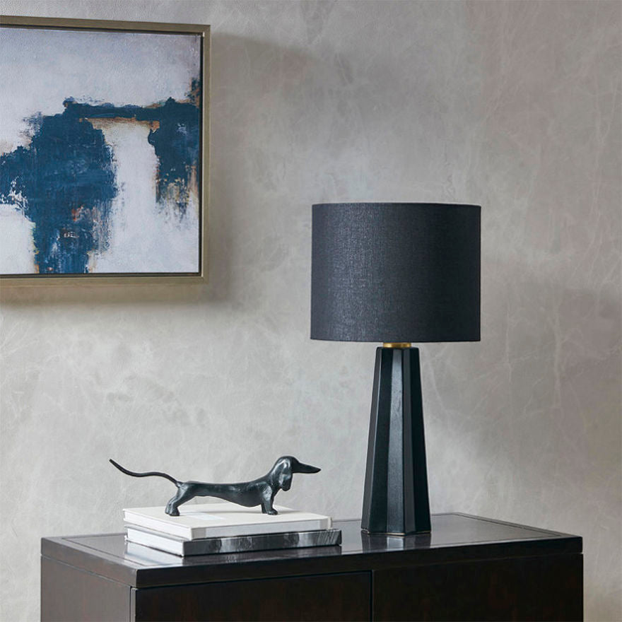 Bring a bold, modern touch to your home with the Martha Stewart Athena Geometric Ceramic Table Lamp. This ceramic table lamp features modern fluted design in a matte black finish with a black shade to create a sophisticated contemporary look. The drum shade is made from linen and is not adjustable. Flaunting a simple and clean design, this black table lamp uses a rotary on/off switch and adds a striking accent to your bedroom or living room. One Type A light bulb is needed and included. Spot clean only.