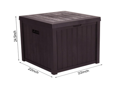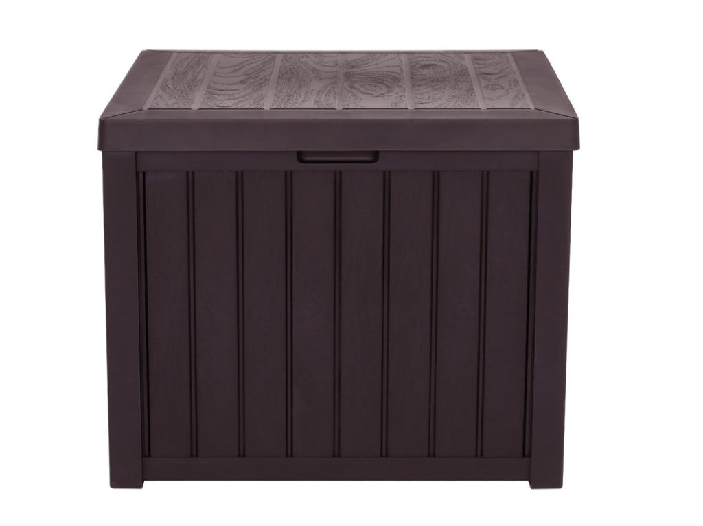 The 51 Gal. resin deck box from Oshion is an attractive storage bin with a wooden exterior that offers ample space to keep your prized outdoor items safe and dry. This weather-resistant crate has a latching, lid with piston-aided opening and closing that will prevent moisture, leaves, pollen and pests from soiling your patio cushions or whatever possessions need safeguarding. this durable deck box also serves as an extra seating option when the need arises.