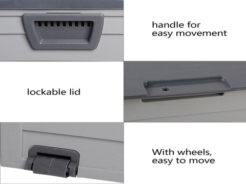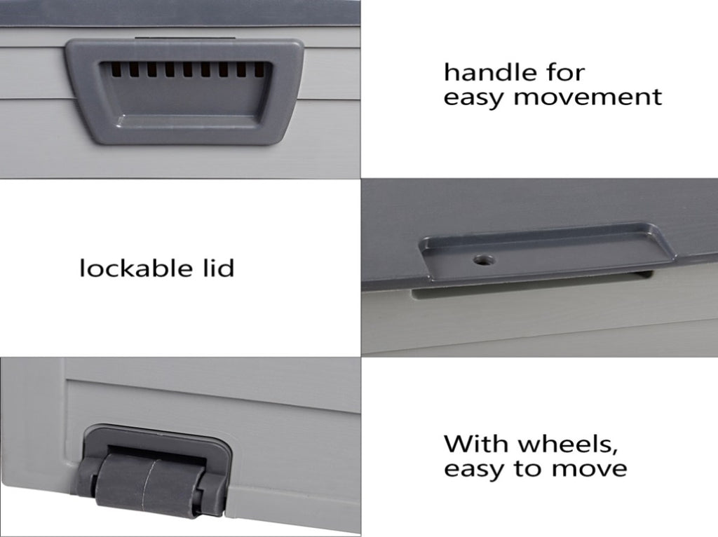 260L Garden Storage Box With Wheels - Formed in hard wearing and durable plastic which is water-resistant, weatherproof, and UV resistant, with a slatted wood-effect finish. Fully sealed design protects against insects and other pests