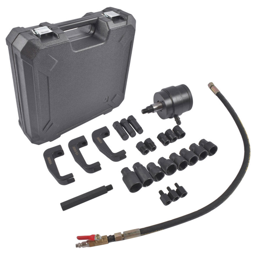 It consists of an air cylinder, a holding device, and various adapters that can be adjusted to fit the injector. The injector is clamped into the holding device, and then the air cylinder is activated to apply force to the injector and remove it from its seat. The injector puller is faster and more efficient than manual methods and can help minimize the risk of damage to the engine or injectors.