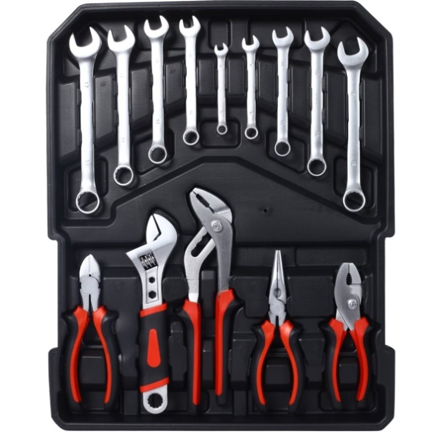 Tool Set Specifications: Tray A: 1PCS-6"LONG NOSE PLIER 1PCS-6"DIAGONAL PLIER 1PCS-6"SLIP JOINT PLIER 1PCS-9" WATER PUMP PLIER 1PCS-8" ADJUSTABLE WRENCH 9PCS-COMBINBATION WRENCH : 6-8-10-11-12-13-14-15-17MM Tray B: 11PCS-COMFORTALIE SCREWDRIVERPH2*100,6*100 ,PH3*150PH2*38,6*38,PH1*75,5*75,PH1*100,4*100,PH0*75,3*75 3PCS-INSULATION SCREWDRIVERPH1*100,4*100, 5.5*125 1PCS-ALUMINUM RATCHET SCREWDRIVER 1PCS-TEST PENCIL:100V-250V 1PCS-TIRE GAUGE 24PCS-25MM CRV BITS 1PCS-58MM BITS HOLDER 9PCS-HEX KEYS1.5-2-2.5-3-4-5-6-8-10MM 6PCS-PRECISION SCREWDRIVER IN PLASTIC BOX Tray C: 1PCS-8" WIRE STRIPPING PLIERS 1PCS-ELECTRIC GLUE GUN 2PCS-GLUE STICK 1PCS-INSULATION TAPE 1PCS-8" KITCHEN SCISSORS 1PCS-UTILITY KNIFE 18MM 1PCS-CLAW HAMMER 1PCS-10" ALUMINUM LEVEL 2PCS-NYLON CLIP 3" 312PCS-SMALL HARDWARE TOOLS IN PLASTIC BOX 1PCS-MEASURING TAPE 5M Tray D: 14PCS-1/2" SOCKETS:8-9-10-11-12-13-14-15-16-17-18-19-20-30MM 15PCS-1/4" SOCKETS: 4-4.5-5-5.5-6-6.5-7-7.5-8-9-10-11-12-13-14MM 1PCS-FLEXIBLE PIPE 2PCS-SLIPING BAR 1/4"&1/2" 2PCS-UNIVERSAL JOINT 1/4"&1/2" 2PCS-1/4"EXTENSION BAR 2"&4" 1PCS-1/2"EXTENSION BAR 5" 2PCS-1/2"SPARK PLUG SOCKETS 16MM&21MM 1PCS-SPINNER HANDLE 2PCS-RATCHET HANDLE 1/4"&1/2" 460PCS-TIES 2.5*100MM 1 PAIRS OF WHITE GLOVES