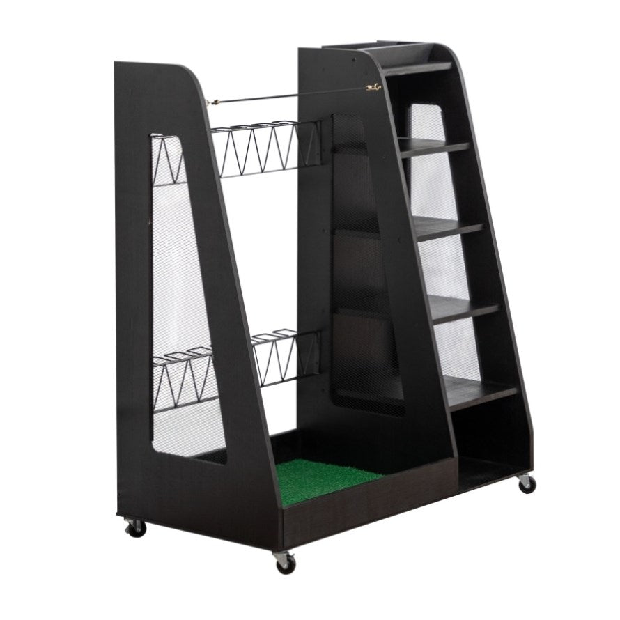 SECURE & NEAT ORGANIZATIONThis golf organizer features a versatile design, easily accommodating 2 golf bags of most sizes. Its spacious shelves can hold 5 pairs of golf shoes , along with golf accessories such as balls, clubs, and towels. All items stay neatly organized within this well - structured unit.