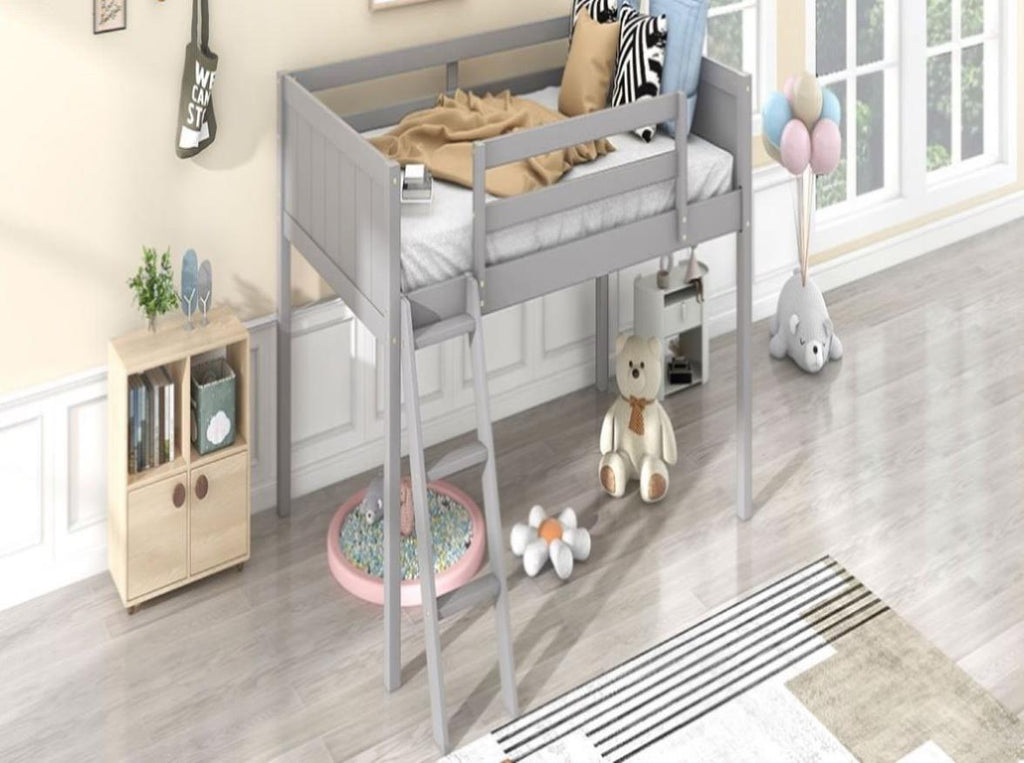 Twin Size Wood Low Loft Bed with Ladder, ladder can be placed on the left or right, Gray