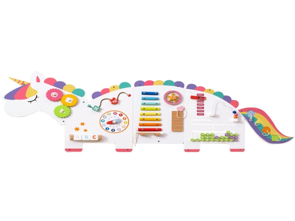 • Montessori Sensory Toy: Designed with a wooden clock, rotary gears, flipping blocks, a xylophone, a spinning block, a scratch board, a tracking game, a week slider, an abacus slider, a sliding made and a shape identification, this 11-in-1 wall busy board offers kids endless fun.