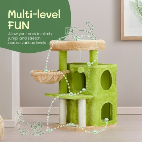 2. Multiple Cozy Napping Spots: Covered in soft, plush velvet, this cat tower boasts a large perch, a cozy hammock, and two spacious condos. Each spot offers your feline friends a variety of comfortable places to nap and unwind, ensuring they always have the perfect place to relax.