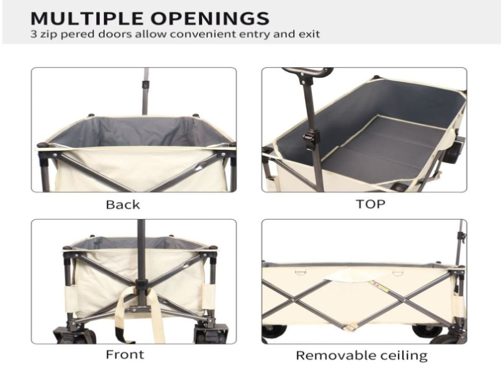 Smooth Transport with All-terrain WheelsThere are 4 big wheels give you a smooth pull and easy transport this portable cart on sand, gravel, grass, or virtually anywhere. Designed with 360°rotating front wheels that make pushing and pulling of wagon easy and convenient