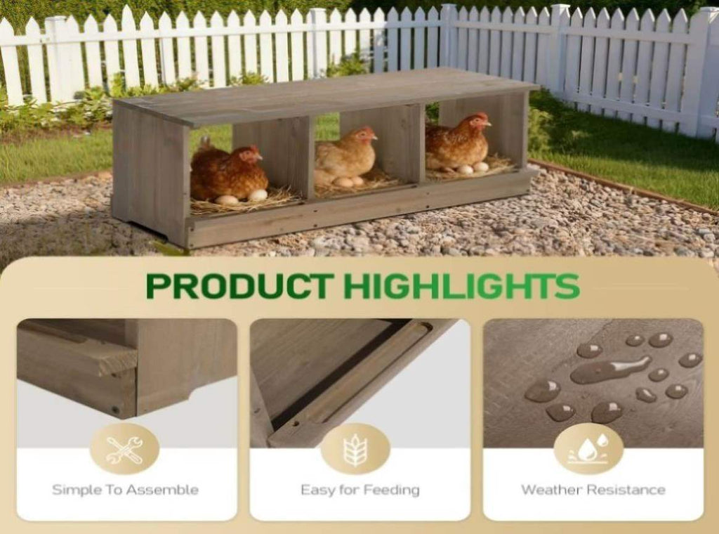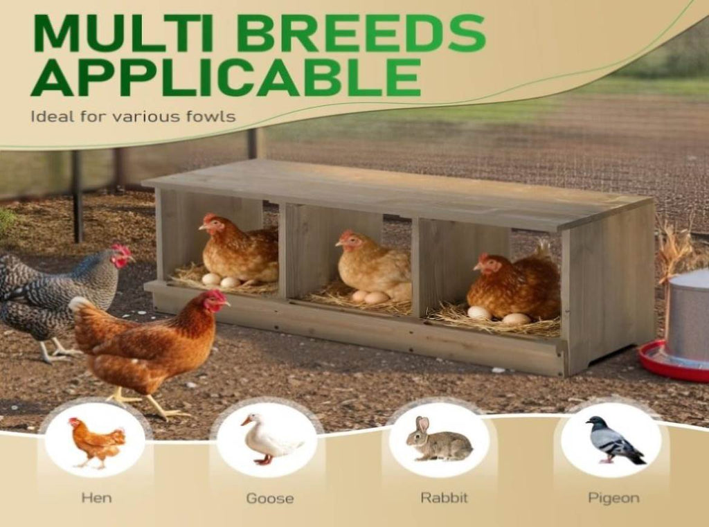 2. Spacious 3-Compartment Design: With three separate nesting spaces, this box comfortably accommodates multiple chickens at once, encouraging better egg-laying productivity.