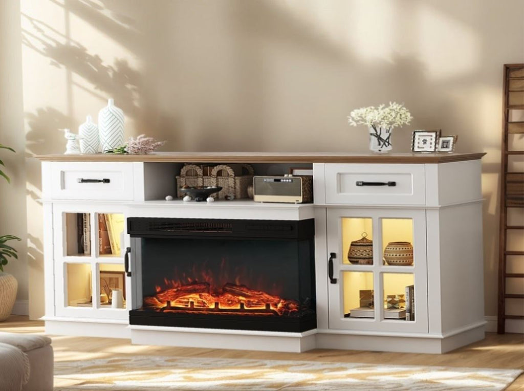 • All-in-One Entertainment Hub: Combines a 58-inch wide TV stand, a 25-inch realistic electric fireplace, and ample storage with 2 doors, 2 drawers, and a shelf.