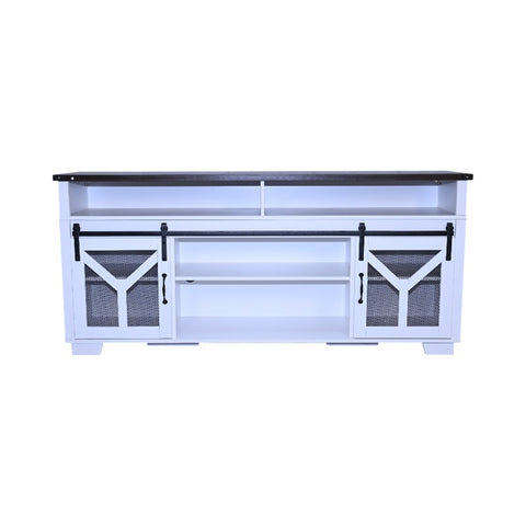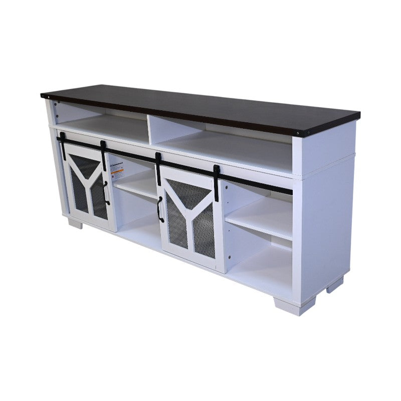 Stylish and Functional DesignThis TV stand features a unique combination of a white body and a black walnut - colored top, creating an elegant and modern look that seamlessly blends with various home decor styles. Sliding barn doors with inset metal mesh and dark iron-tone hardware not only add a touch of rustic charm but also provide convenient storage access, allowing you to keep your media devices and accessories organized.