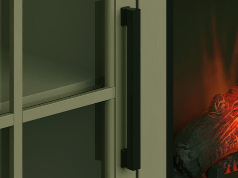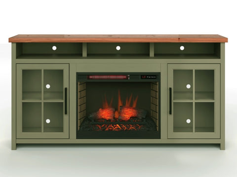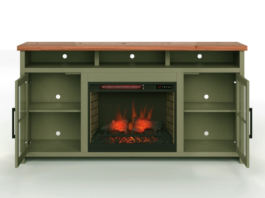 This 74 inch Fireplace TV Stand Console delivers a flawless combination of modern farmhouse style and country simplicity. Beautifully crafted from Poplar Solids, Okoume Veneers and Knotty Alder, this Fireplace Entertainment Center features a two-tone Sage Green and Fruitwood finish and oil-rubbed Bronze hardware. Ideal for TVs up to 85 inches, this Fireplace TV Stand includes two glass windowpane doors, three shelves and cable management on the back panel for media and gaming console storage. The 28 inch electric fireplace insert includes a remote control and multiple settings allow for heat up to 400 square feet. Four (included) screws make securing the fireplace insert to the console quick and simple.