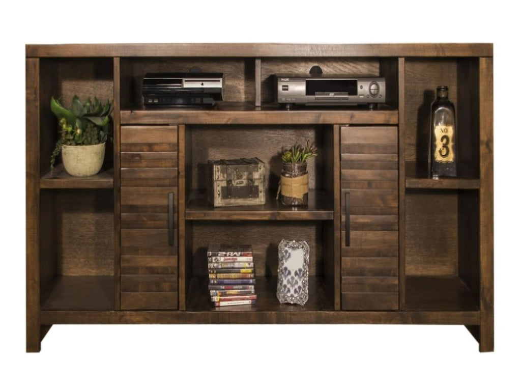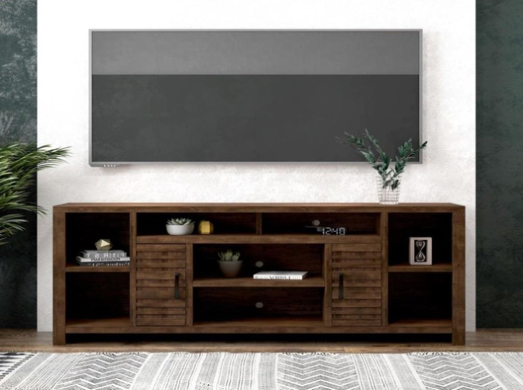 This 74 inch TV Stand Console delivers a modern robust silhouette with a slightly rustic and urban feel. Skillfully crafted from Knotty Alder Solids and Veneers, this entertainment center boasts intentional distressing and a rich Whiskey finish that enhances the natural wood grain. Featuring six shelves and two doors with horizontal slat detailing and Flat Black hardware, this TV Console will accommodate TVs up to 85 inches and provide ample storage for media and gaming consoles and home décor favorites. Cable management openings on the back panel will keep your cords and wires concealed. Fully assembled upon arrival, this piece is ready to unbox and enjoy.
