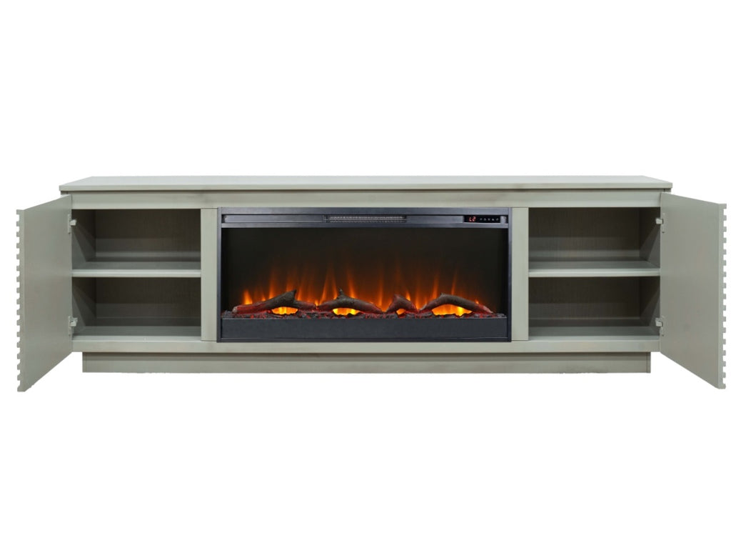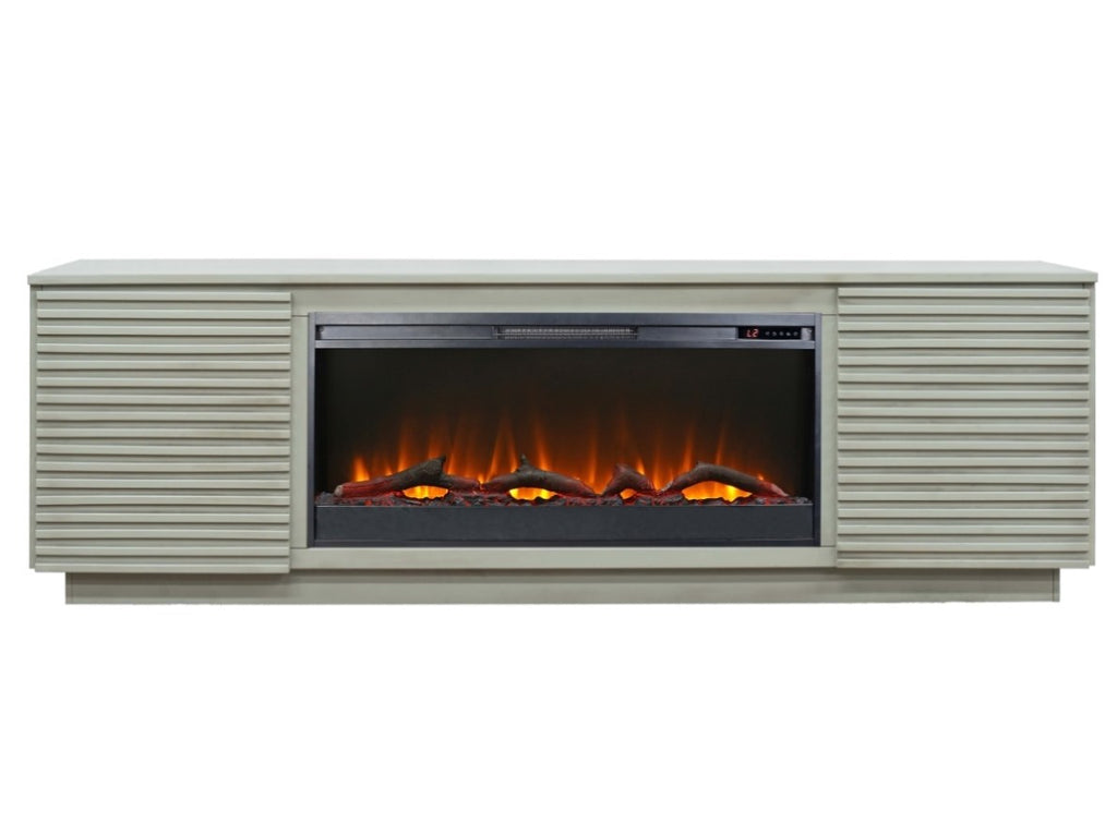 Bring home this 89 inch Fireplace TV Stand for a sophisticated and upscale addition to your living room or great room. Artfully crafted from Poplar Solids and Okume Veneers in a Sandstone finish, this showstopping Electric Fireplace TV Console boasts clean lines and chic modern style. Featuring two doors, two shelves and cable management openings on the back panel, this Fireplace Entertainment Center will accommodate TVs up to 100 inches and provide ample storage for media and gaming consoles. The 42” Electric Fireplace Insert includes a remote control and multiple settings allow for heat up to 400 square feet. Four (included) screws make securing the fireplace insert to the console quick and simple.