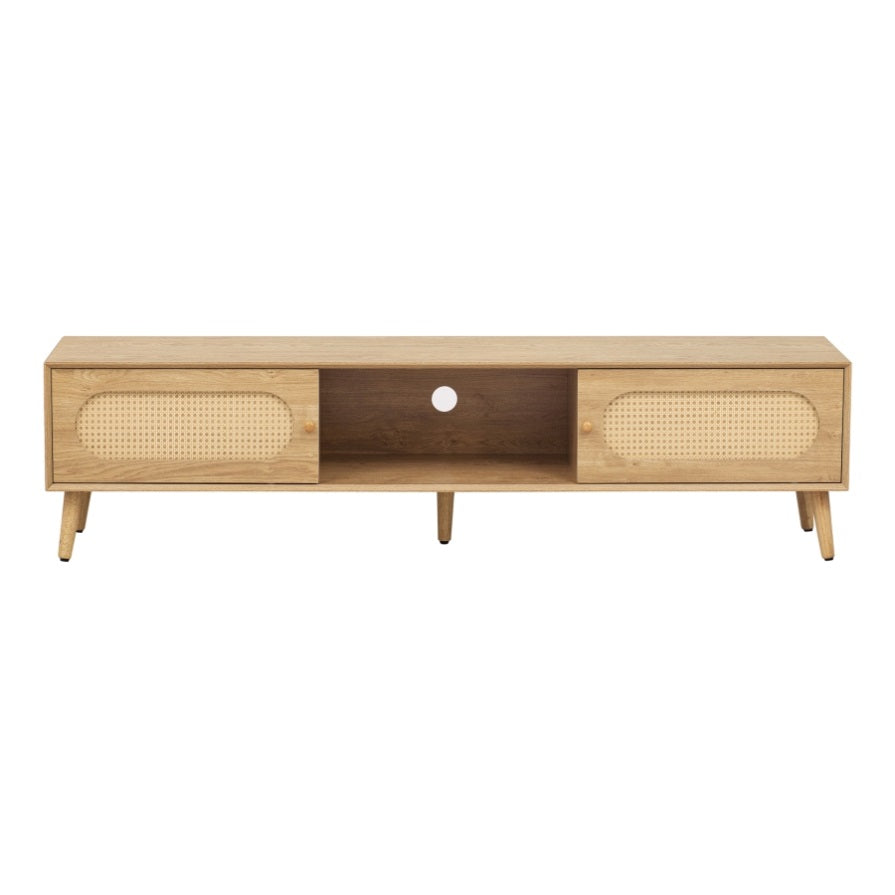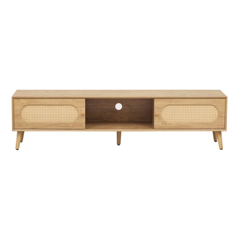 This Boho-style TV cabinet features a rattan-like wood color design, showing a unique fusion of nature and art, bringing a relaxed and free home atmosphere. Carefully selected MDF and solid wood leg materials ensure stability while giving the cabinet a natural wood texture and elegance. Two sliding doors with slides not only add a smooth modern feel, but also make the use of space more flexible and convenient. A drawer provides additional storage space, which can easily store small items and keep the desktop tidy. Two cable management holes help manage cables to avoid clutter and ensure that the TV area is refreshing and orderly. Whether placed in the living room or bedroom, this Boho-style TV cabinet can inject a natural, comfortable artistic atmosphere into your home space, enhancing the overall style and practicality.