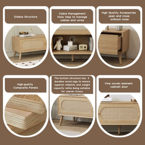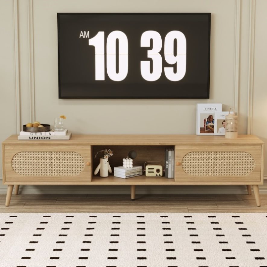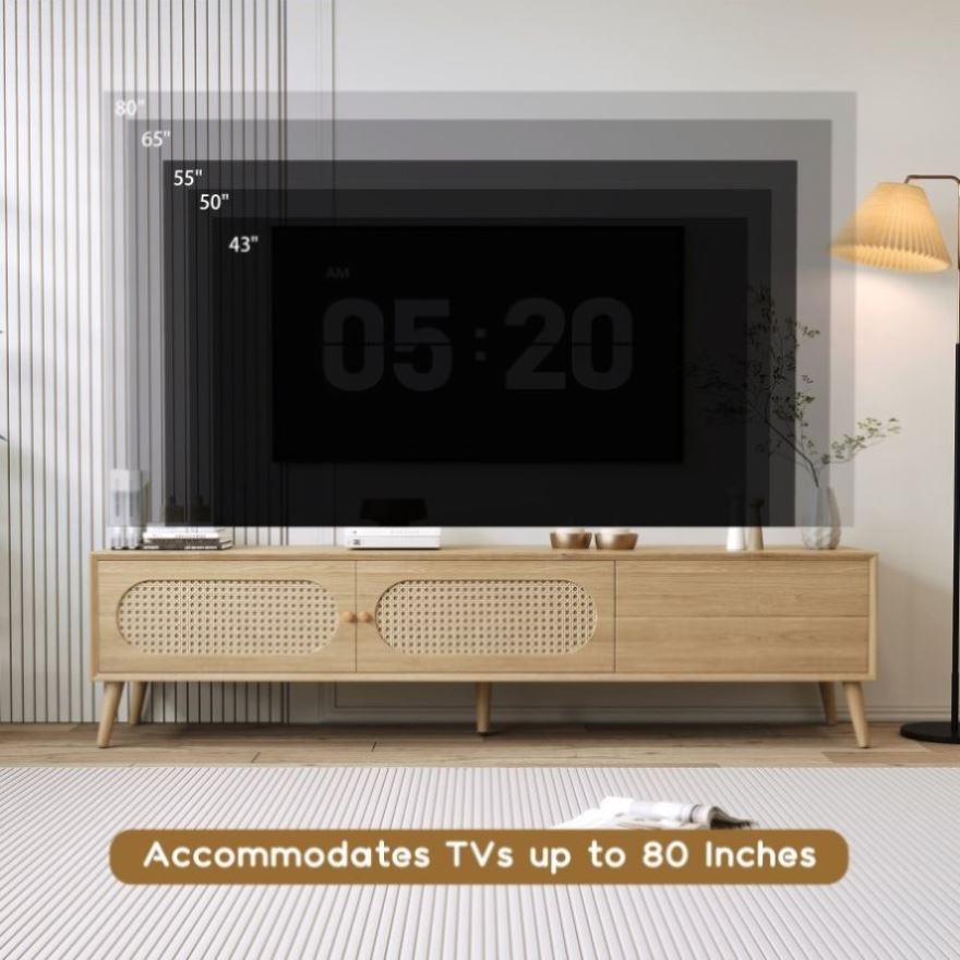 [Farmhouse Rattan TV Cabinet] The wooden TV cabinet combines classic and modern, with farmhouse-style rattan decoration, bringing a brand new visual effect. The longer desktop can accommodate 80-inch TV.