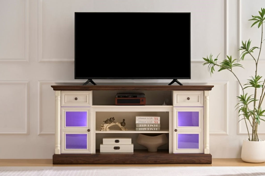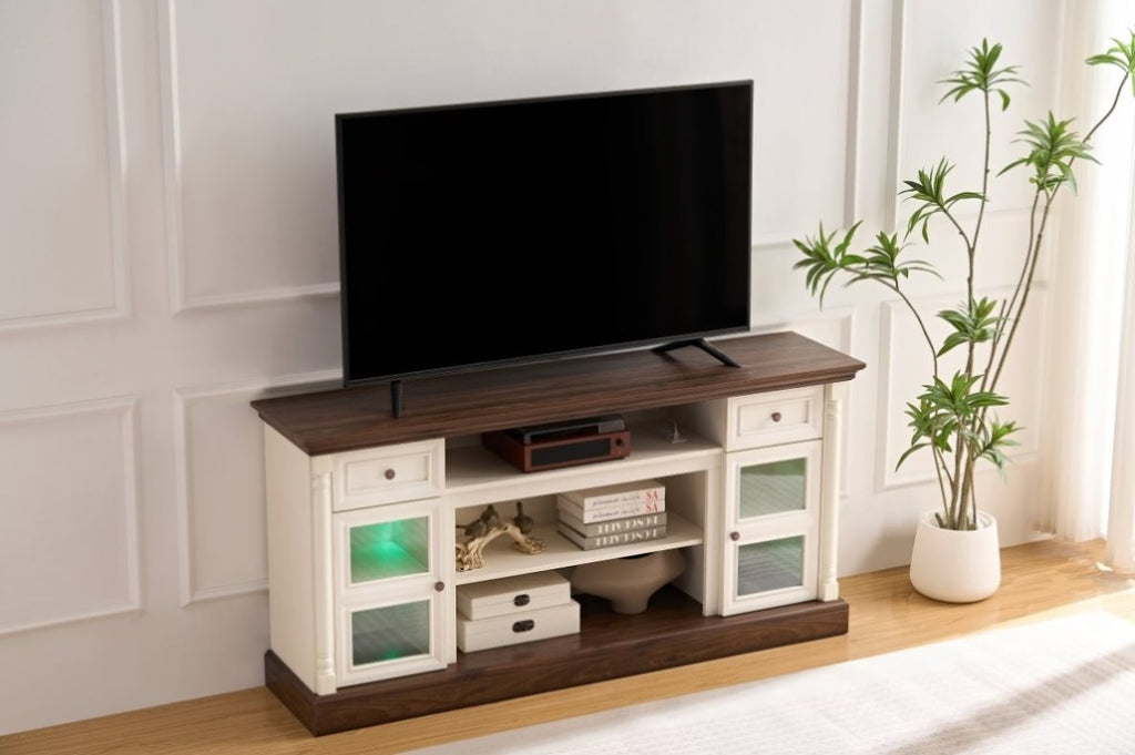 Farmhouse Fireplace TV Cabinet - This 70-inch TV cabinet fits TVs up to 80 inches and features adjustable LED scent lighting for a great visual experience!