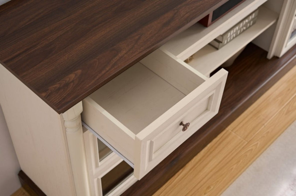 Featuring an antique woodgrain finish with delicate Roman column detailing adorning the sides, the TV stand maintains its natural, rustic character while adding a touch of sophisticated and elegant vintage flair to your space.
